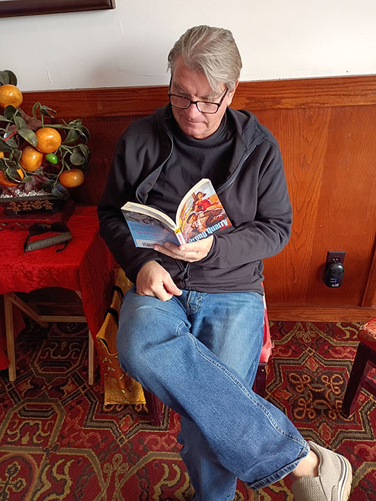 Our friend Dave — caught in the wild reading Quarry!