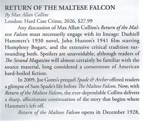 Ninety-six years later, with the copyright on Hammett’s best-remembered (and most-filmed) tale having lapsed at the end of 2025, Iowa crime-fictionist Max Allan Collins seeks to add another “something special” to the Falcon legend. In Return of the Maltese Falcon, released this month by Hard Case Crime, he has boldly resuscitated the original book’s “hard and shifty” protagonist, San Francisco private investigator Samuel Spade, and sent him back out to locate the bejeweled bird of the title—which, you will likely recall, was never recovered in Hammett’s hard-boiled classic.