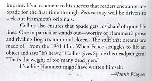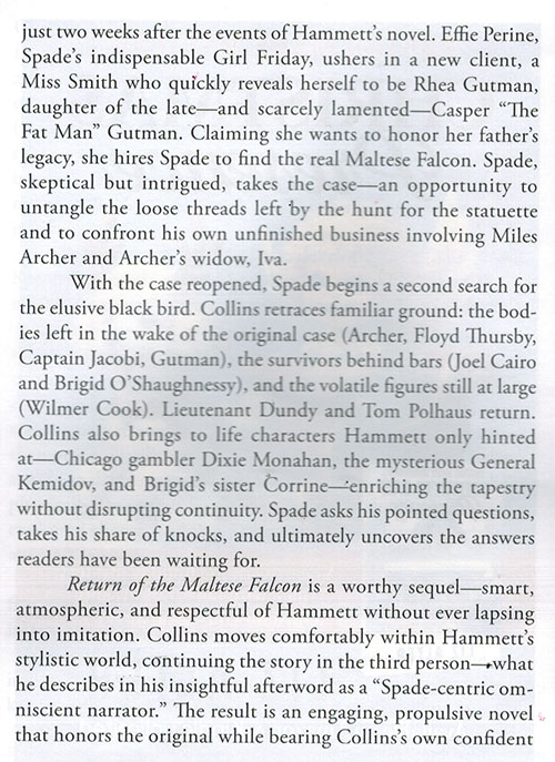 Penning a sequel to such a seminal genre work can only be characterized as intimidating. Indeed, Collins acknowledges that “avoiding strictly pure mimicry, and writing in my own style while honoring Hammett’s, was a tightrope to walk.” But the critical reception for Return of the Maltese Falcon has so far been generally favorable. Kirkus Reviews remarks that “Collins’ dialogue sounds pleasingly like Hammett’s; his plotting is even twistier; and if his descriptions mix Hammett’s terse, affectless minimalism with Raymond Chandler’s fondness for florid similes, that’s clearly, as he notes in an engaging coda, his intention. Fans convinced that nobody could possibly continue a tale that ends so definitely owe it to themselves to give Collins a try.” Reviewer Ray Palen of Bookreporter says Return is “a work of wonder, and I enjoyed every second of it. Collins has not just inhabited Hammett’s world but breathed new life into it and made it distinctly his own.” Finally, prolific author and blogger James Reasoner observes that, “stylistically, Collins’ fast-moving, straight-ahead prose isn’t quite as stripped down as Hammett’s, but it’s certainly in the same ballpark.” He adds: “The resolution of the mystery and the way the book wraps everything up are extremely satisfying.”